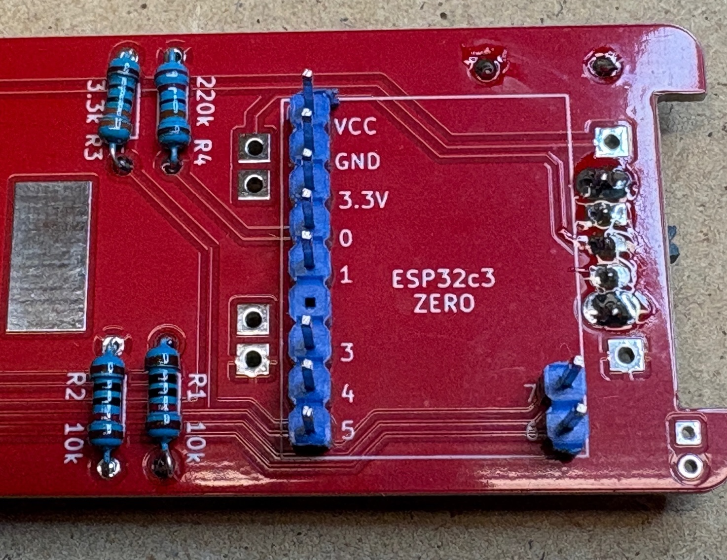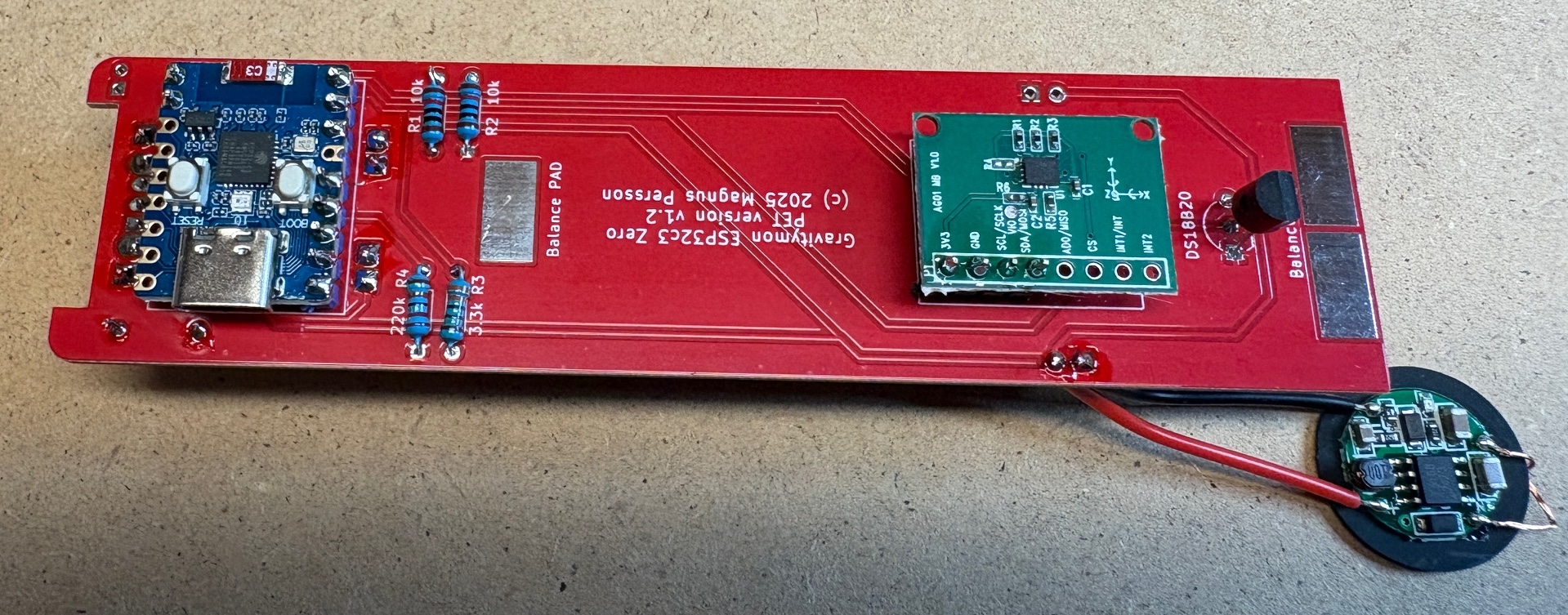 I recommend to use the v1.2 of the Gravitymon PET PCB which has been converted to use 3.3V for all sensors. Older PCB use the standard iSpindel schematics which will put 5V when charging on the GPIO pins which can damage the ESP32c3. An easy fix for the older PCB is to connect the tempsensor pull-up to 3.3V on the ESP32 (use the inner hole) on the PCB.