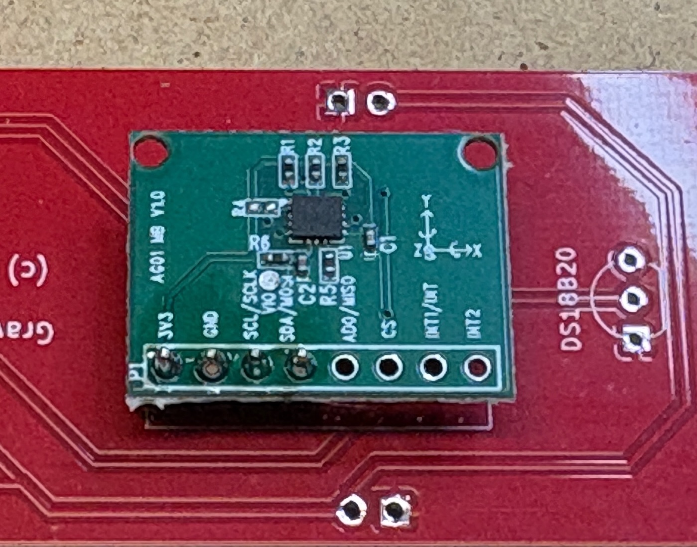 Mount and solder the gyro. Try to mount it leveled with the PCB, a tip is to place something flat between the gyro and PCB to ensure the gyro is leveled.